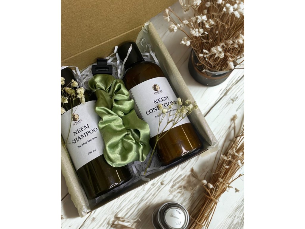 Neemový šampón a kondicionér sú obohatené o výťažky z neemového stromu (Azadirachta indica), ktorý je známy svojimi antibakteriálnymi, protizápalovými a posilňujúcimi účinkami. Pomáha upokojiť pokožku hlavy, znižuje tvorbu lupín, posilňuje korienky a zanecháva vlasy čisté, jemné a hydratované. Saténová gumička je šetrná k vlasom, neťahá ich a nepoškodzuje.